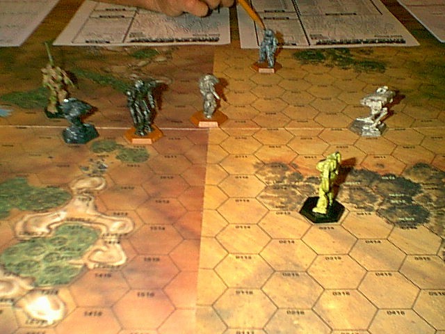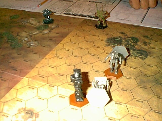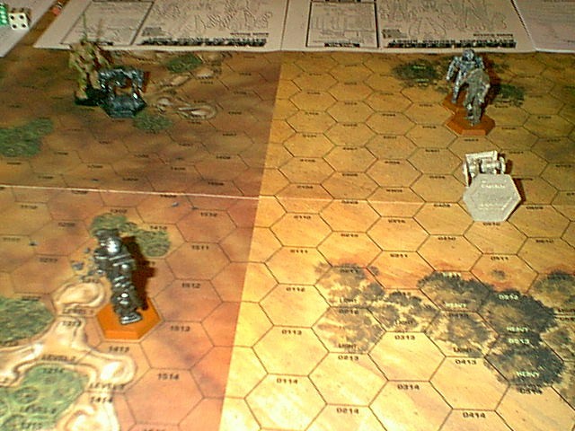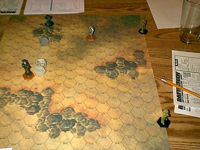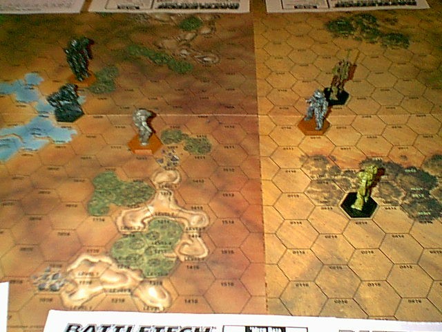 Defenders - Viper (Javelin mini), Ice Ferret (Archer mini), Vapor Eagle (Shadowhawk mini), and Predator (MenShen mini)Arc Royal was a sparse, slightly hilly territory. Commander Ambitious had his team of mechs split up with the Ice Ferret piloted by a veteran named Larry and the Predator controlled by a new pilot named Curley going into some light woods. The other two mechs flanked on the right as soon as Commander Dragon's three mechs were in long range.